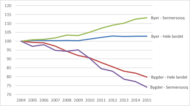 Figur: Illoqarfinni nunaqarfinnilu innuttaasut amerlassusiisa 2004-imiit 2015-ip tungaanut nikerarnerat, Naatsorsueqqissaartarfik