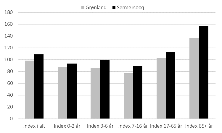 65-iniit qummut ukiullit ingammik illoqarfinni takussaanerupput, tamakkunani tamakku amerleriarnerpaasimapput (Illoqqortoormiini 87 %-inik, Nuummi 81 %-inik Tasiilamiliu 52 %-inik). 17-iniit 65-inut ukiullit illoqarfinni marlunni eqiterullutik amerleriarnerpaasimapput, tamatumani Nuummi inuit 2.200-nik amerlisimapput (21 %) aamma Tasiilami 230-nik amerlisimapput (21 %).