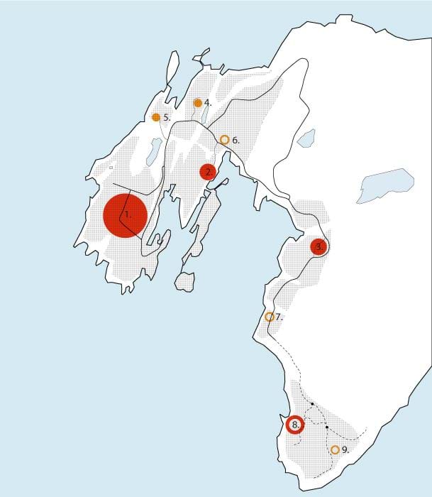 Aappalaartoq: illoqarfiup ilaani qiterisaqarfik, orange: sumiiffimmi qiterisaqarfiit, orange ammalortut ammasut: siunissami sumiiffimmi qiterisaqarfissat