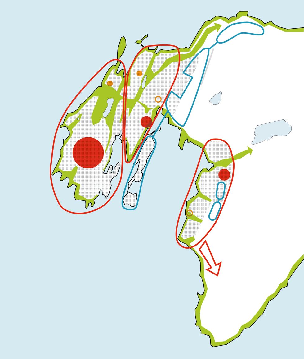 Røde streger: bydele, røde cirkler: bycentre, orange cirkler: lokalcentre, orange åbne cirkler: fremtidige lokalcentre, blå streger: erhvervsarealer, grønne markeringer: friholdt landskab og grønne strøg