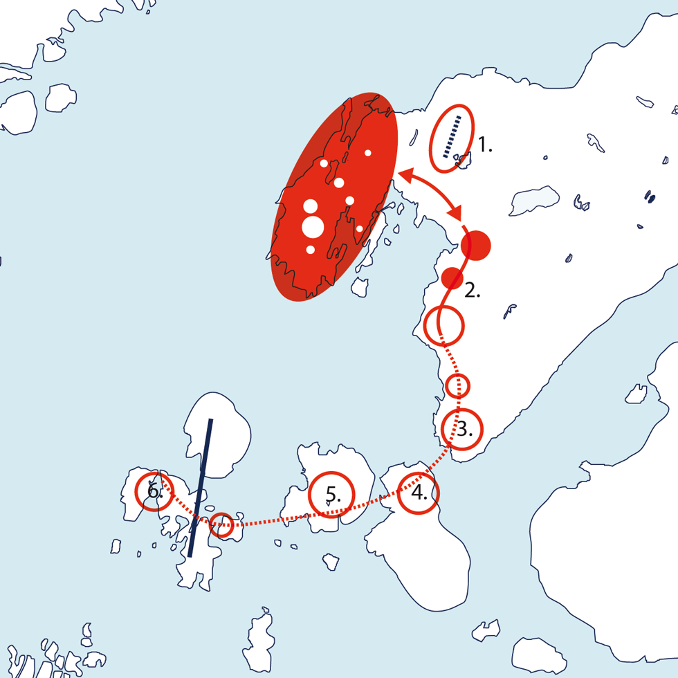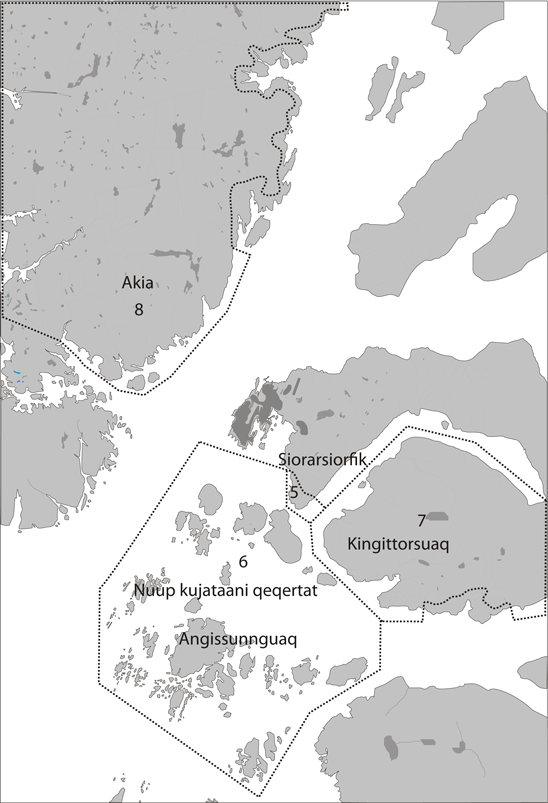 Byvækstområder og mulige byvækstområder: 1: lufthavnen, 2: Qinngorput, 3: Siorarsiofik, 4: Aqissersiorfik, 5: Tartunnguaq, 6: Ikarissat