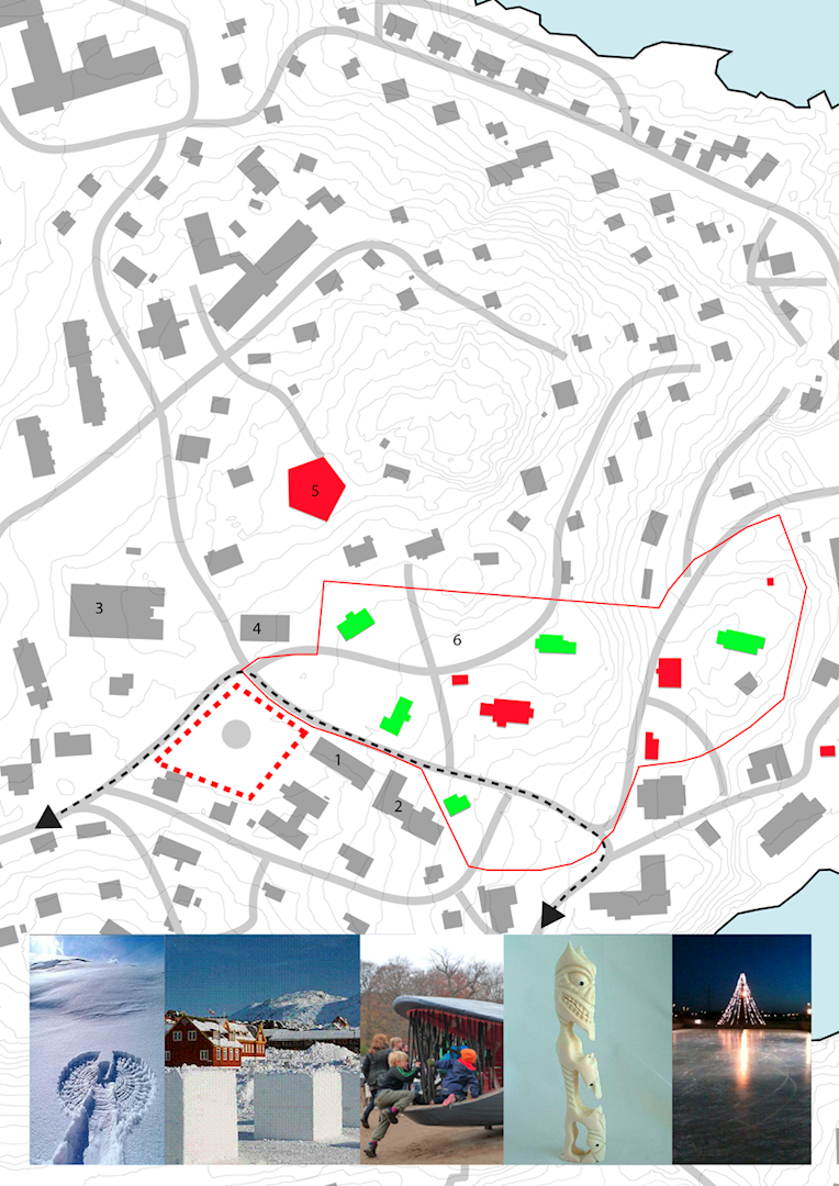 1: Tasiilap atuarfia, 2: inuussutissarsiut, 3: Pilersuisoq, 4: hali, 5: suliffeqarfiit, ammukaartulik: inissiat, tikkuut: pingaarnertut angallaffiup ingerlaarfia