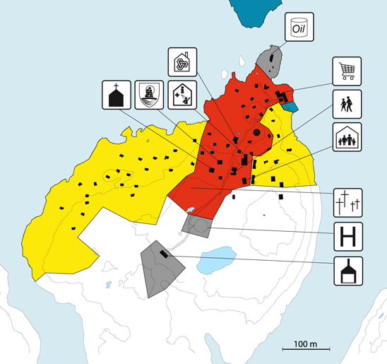 Nunaqarfimmi ataatsimoorussat immikkoortumi umiarsualiviup eqqaaniittut tassaapput pisiniarfik, qui, allakkerivik, banki, tarajorterivik, gassiisivik tankeqarfillu. Umiarsualiviup avannannguaniipput atuarfik, oqaluffik, illu sullissivik, katersortarfik qatserisarfillu.